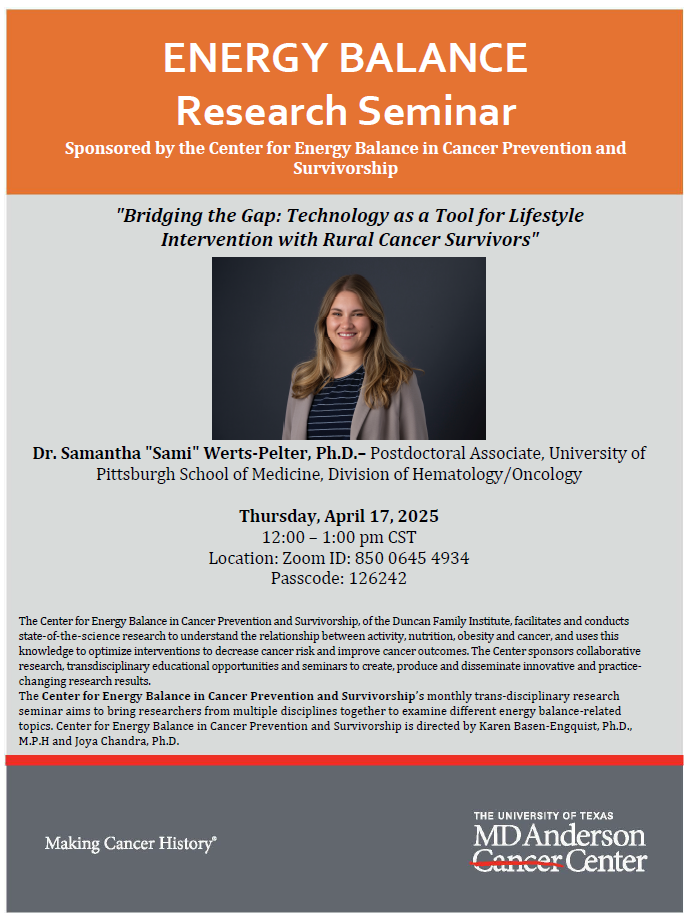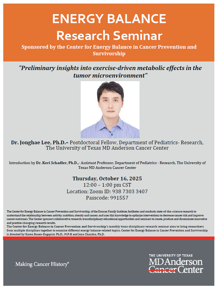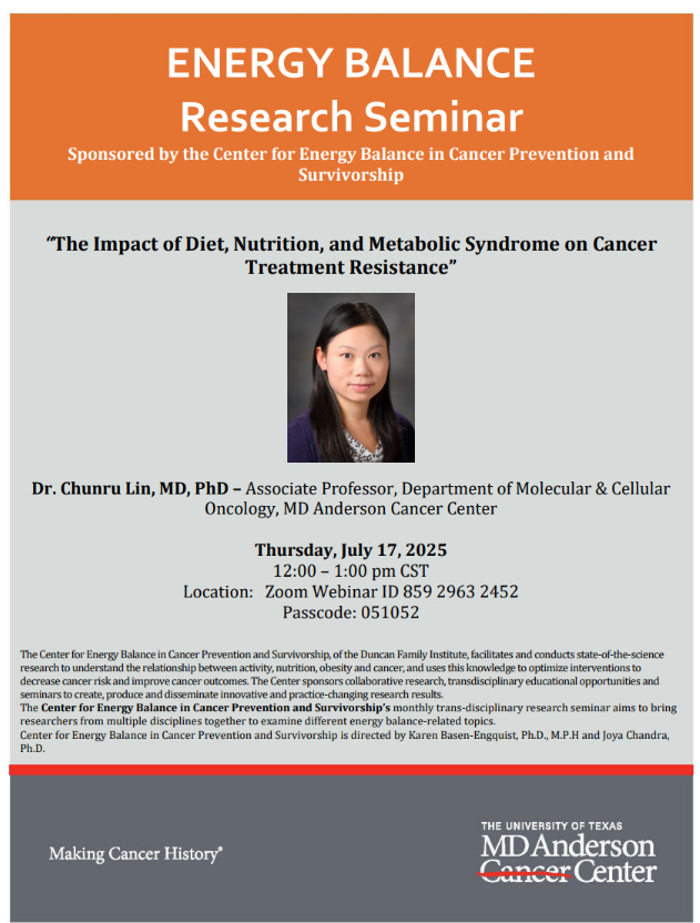 The Center for Energy Balance in Cancer Prevention and Survivorship's monthly transdisciplinary research seminar aims to bring researchers from multiple disciplines together to examine different energy balance-related topics. We intend to highlight the translational and transdisciplinary nature of energy balance research and promote communication between interested researchers.