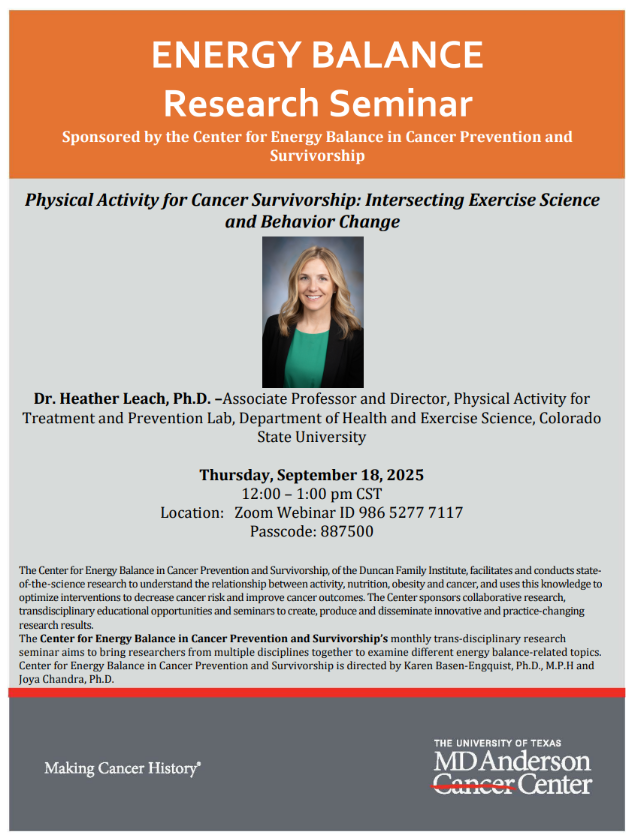 The Center for Energy Balance in Cancer Prevention and Survivorship, of the Duncan Family Institute, facilitates and conducts state-of-the-science research to understand the relationship between activity, nutrition, obesity and cancer, and uses this knowledge to optimize interventions to decrease cancer risk and improve cancer outcomes. The center sponsors collaborative research, transdisciplinary educational opportunities and seminars to create, produce and disseminate innovative and practice-changing research results.